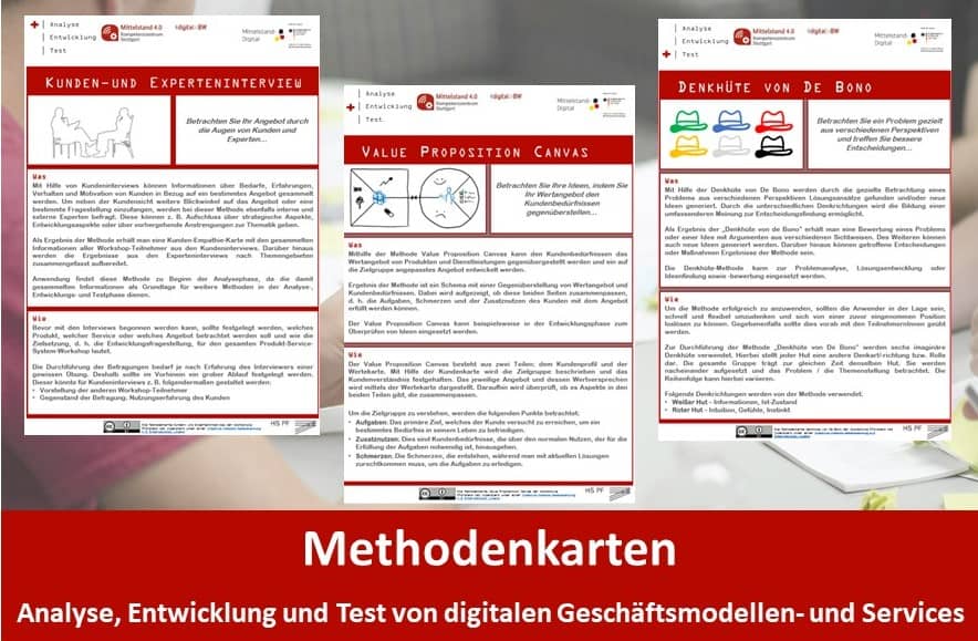 Auch hier gibt der Beitrag Aufschluss und beantwortet die Fragen. Die insgesamt 25 recherchierten und aufbereiteten Methodenkarten bieten Ansätze um die bestehenden Geschäftsmodelle weiterzuentwickeln und neue Serviceideen zu etablieren. Zudem liegen konkrete Anwendungshinweise in den Bereichen Analyse, Entwicklung und Test vor. Die Methodenkarten stehen kostenfrei zur Verfügung und unterstützen Ihr Unternehmen auf dem Weg in die digitale Transformation.